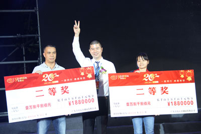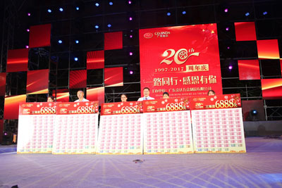 活動當天不僅準備了豐盛的晚宴,還有激動人心的幸運抽獎,設置五大項抽獎環節、尾數號抽獎、壓軸萬元現金大獎,高達40%的中獎機率。此時此刻,已成為了廣東金達二十周年慶典晚會的重頭戲,火爆全場。